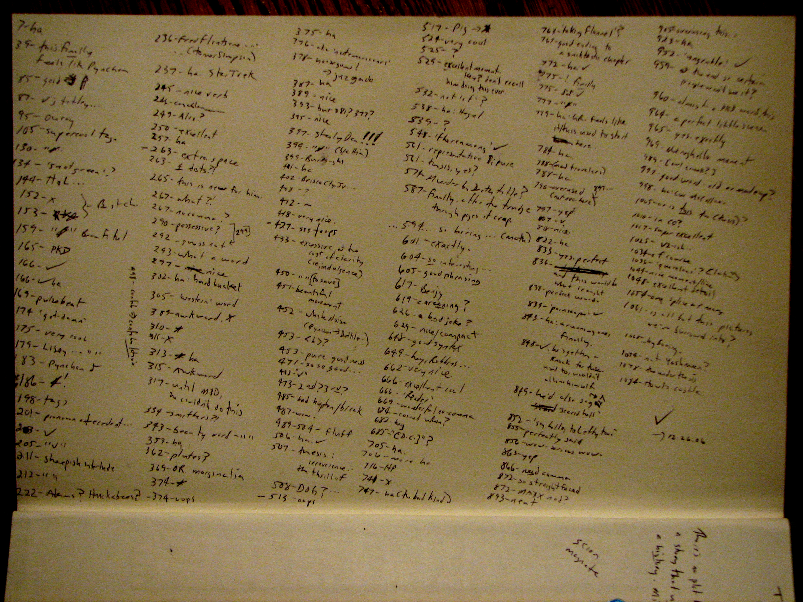 I first read Pynchon when I was twenty-two, I think, between a B.A. and an M.A. The only reason I read him, too, was because I’d hit up a professor I trusted for a list of books I’d need to have read if I didn’t want to get laughed out of grad school. She of course gave me an excellent list — Nabokov, Heller, etc — but, when guiding me through the highs and the lows of all these titles, that professor stopped at Gravity’s Rainbow, said I wanted to stay far away from that one, as it had 500 characters and a storyline for each. Which, I mean, I’d just inhaled all of Tolstoy and Dostoyevsky I could, and had a bachelor’s in philosophy in my pocket. So I accepted the challenge, went to the library, dug up a Gravity’s Rainbow and went swirling down into it, taking notes and making marginalia as I went, like I always do (more below), but doing it this time on a slip of paper, as I was going to have to turn this book back in. Years down the road, I’d of course pick up my own copies of GR, and, for a while even, remember which version my little slip of notes went with. But it’s gone now, so I don’t have any record of my first (and, so far, only) read of GR. The experience, though: it did twist my head, lose me, make me grin and leave me laughing, wanting more. So I found V., The Crying of Lot 49 — and this one I have read I don’t know how-many-times — then fell deeper into that hole, hit Vineland and the short stories and every scrap of Pynchonalia I could find, by, about, whatever. I was hooked, a convert, an acolyte. But. To know something about me that first summer I read Pynchon: all I knew then, I think, were sentences. I mean, I’d stumble onto a decent story-ending every now and again, or a nice hook, a nice shuffle between scenes or whatever, but by and large I was having some big romantic affair with language; I read Cormac McCarthy not for the stories, but, first, the vocabulary, and, second, the prose rhythm. And of course Pynchon’s sentences, while not quite as stacked as McCarthy’s when he’s really rolling, still, there’s a different, maybe even more permanent kind of magic there. Because he moves things back and forth at . . . I’ve yet to figure it out, I guess. But it’s a level just above the words.