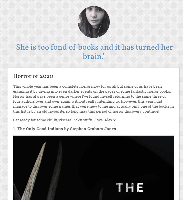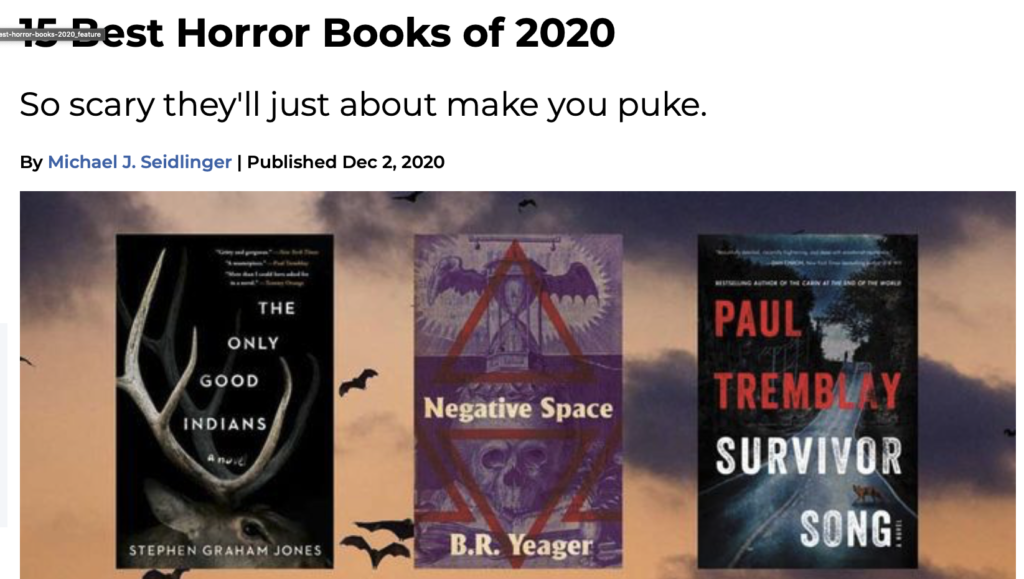 HomeelkAll the Pretty (Elk) Lists Or, a stack of best of 2020 lists, featuring The Only Good Indian, starting with The Washington Post: https://www.washingtonpost.com/entertainment/books/best-science-fiction-fantasy-and-horror-books-of-2020/2020/11/18/a7dca92e-1aba-11eb-82db-60b15c874105_story.html https://www.libraryjournal.com/www.libraryjournal.com/?detailStory=best-books-of-2020-horror https://www.shelf-awareness.com/issue.html?issue=3877#m50707 https://apps.npr.org/best-books/#view=covers&year=2020 https://wordfest.com/2020/seasonal-giftings-recommended-books/balzhan-sitaliyeva/ https://offtheshelf.com/2020/12/goodreads-choice-awards-finalists/ https://tribalcollegejournal.org/the-best-native-books-of-2020/ https://vernacularbooks.com/2020/11/30/a-c-wise-presents-her-years-best-books/ https://the-line-up.com/best-horror-books-of-2020 A Year in Reading: Paul Tremblay https://www.theglobeandmail.com/arts/books/article-the-globe-100-our-favourite-books-of-2020/ https://booksandbookskw.com/our-favorite-books-read-in-2020/ The Best Reviewed Sci-Fi, Fantasy, and Horror of 2020 https://litreactor.com/columns/litreactor-staff-picks-the-best-books-of-2020-part-ii https://alexsfictionaddiction.tumblr.com/post/636978242941829120/horror-of-2020