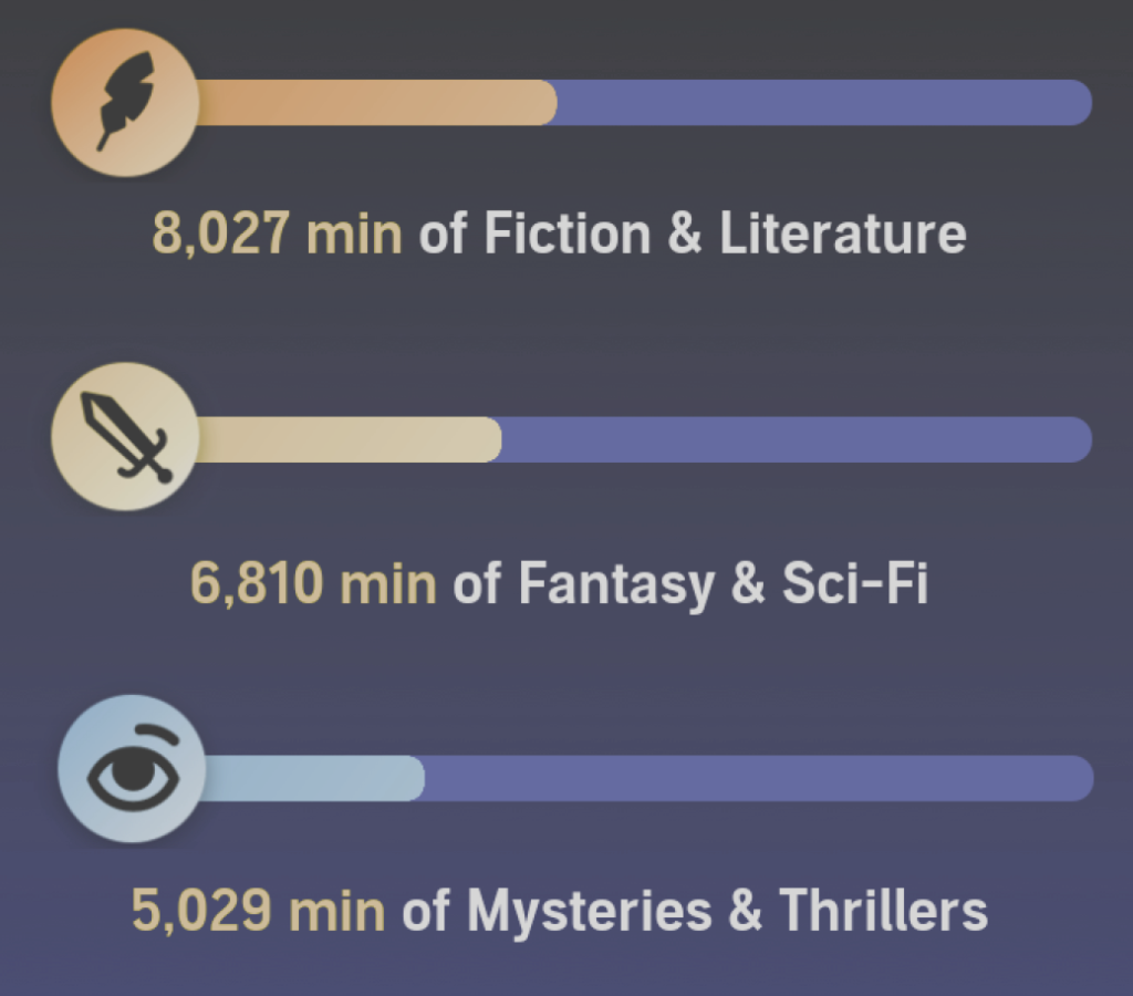 HomeetcAudible stats for 2021 Guess everybody else just got theirs too, yes? Wild. guessing Horror is in either SF&F or Mysteries/Thrillers? I do not remember that “binge.” but maybe that’s how binges work?