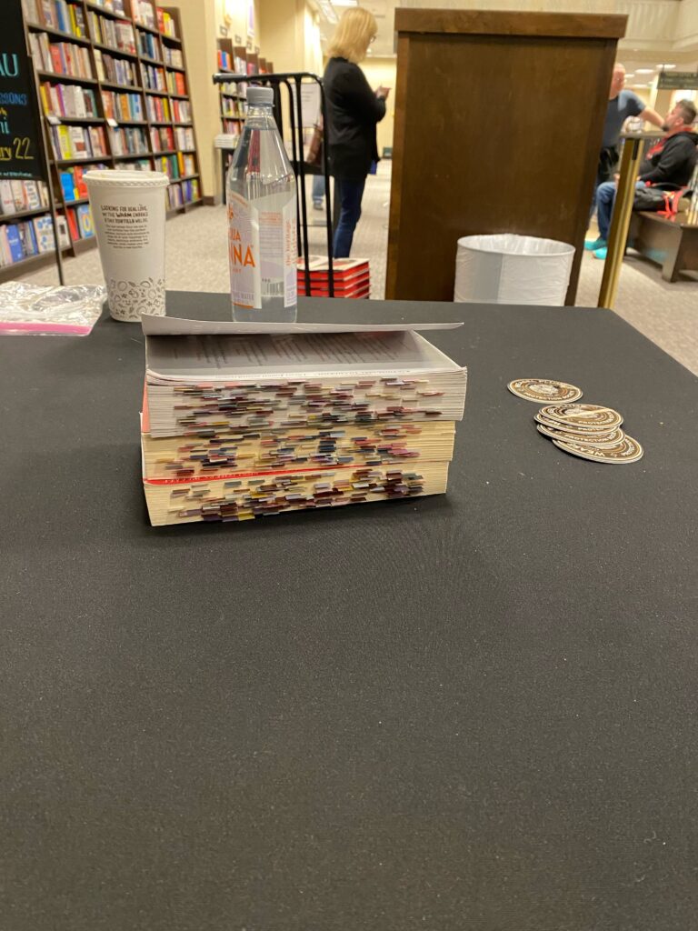 Then afterwords it was hanging with friends until we shut a place down. After which, I managed to remember to get my hat, but . . . forgot my bag of pens and junk. First time ever to do that, all these tours, all these many events and visits &etc. But? Evonne at the B&N was on the case: she retrieved the bag, overnighted it to me. At which point . . . UPS lost it. But? They found it! So I’ve got my pens and stamps, and my cool Michener Ctr. small-tote-with-zippertop (zipper makes all the difference).