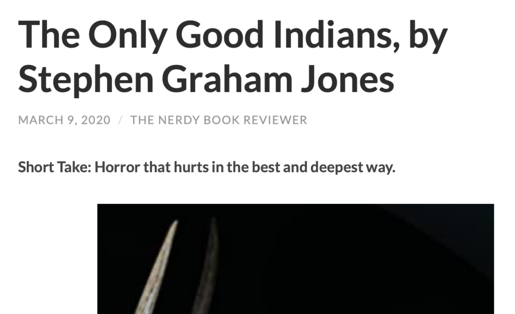 HomeelkBook Nerds + Elk Kind words: https://booknerdsbraindump.wordpress.com/2020/03/09/the-only-good-indians-by-stephen-graham-jones/