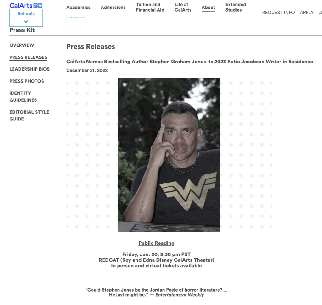 HomeeventsCalArts https://calarts.edu/about/news-and-events/press-kit/press-releases/calarts-names-bestselling-author-stephen-graham-jones-its-2023-katie-jacobson-writer-in-residence