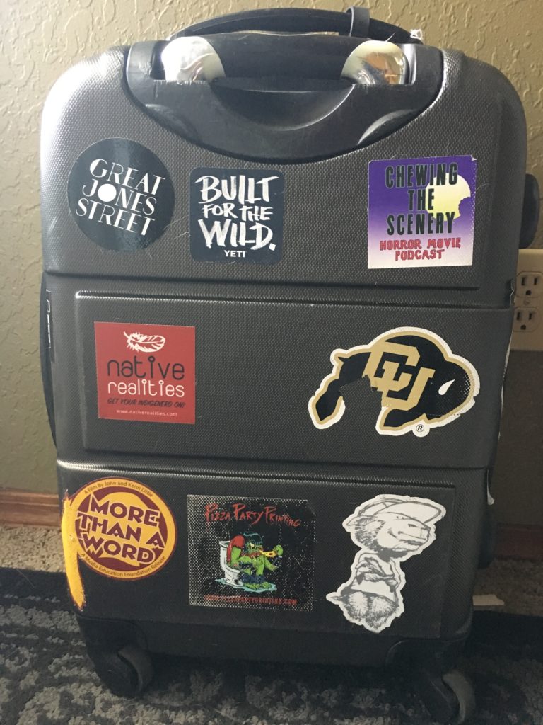 That always kind of breaks my heart. And, I’m not in the rodeo, but I am on a circuit of sorts: always boarding a plane for some other place. And, the time’s finally come to retire the carryon that’s kept my stuff safe for probably four years now—100,00 miles, I’d guess? Probably a lot more. There were a couple other bags in between—better wheels, longer handles, outside pockets—but they wore out fast. This little one always hung around. But, this last trip to Providence, it finally started stumbling. In the luggage world, that means I got stuck on two jetways, trying to get the bent handle to retract. Anyway, goodbye to this one also means goodbye to all my favorite stickers: