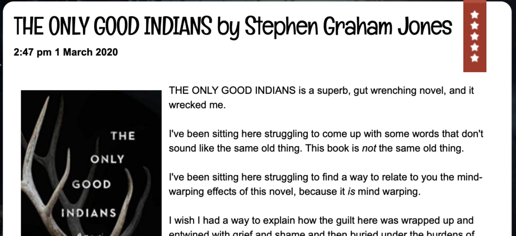 HomeelkChar’s Horror Corner So cool write up on The Only Good Indians: I mean, look at all them stars . . .