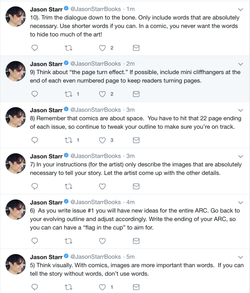 Solid advice from Jason Starr. (good novelist, too) And, since I don’t have time right now to search up how to embed eleven tweets (“Moment?” “Storify?”) when they’re not self-grouped with some hashtag—like I’d know then, either—I just screencapped them out. So, they are, all upside down.