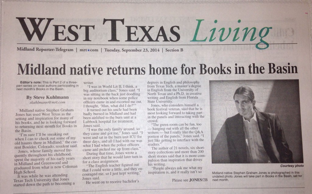 For the weekend, anyway. And, I’m thinking this is my third time in the Midland Reporter-Telegram? I showed up once when I was about twelve, though I cannot begin to suspect what for. Oh, no: maybe it was for Old Settlers Days in Stanton. And maybe it was the news, not the paper. I was cutting cowchips with my knife, to win the big (throwing) contest. Which, I did, but not that year. Anyway, MRT is also the first place I was ever published. I was about twelve then as well. My little brother, over cereal before school, realized he was supposed to have written a myth for homework. Like, explaining where this or that came from. So I did it for him right quick, and he won some contest with it, and then it got published in the newspaper, under his name. But it’s my story. Or, ours, I guess. Anyway, here’s the most recent write-up, some thirty years after the other times (click the imgs for full-size/readablem or click here for the on-line version):
