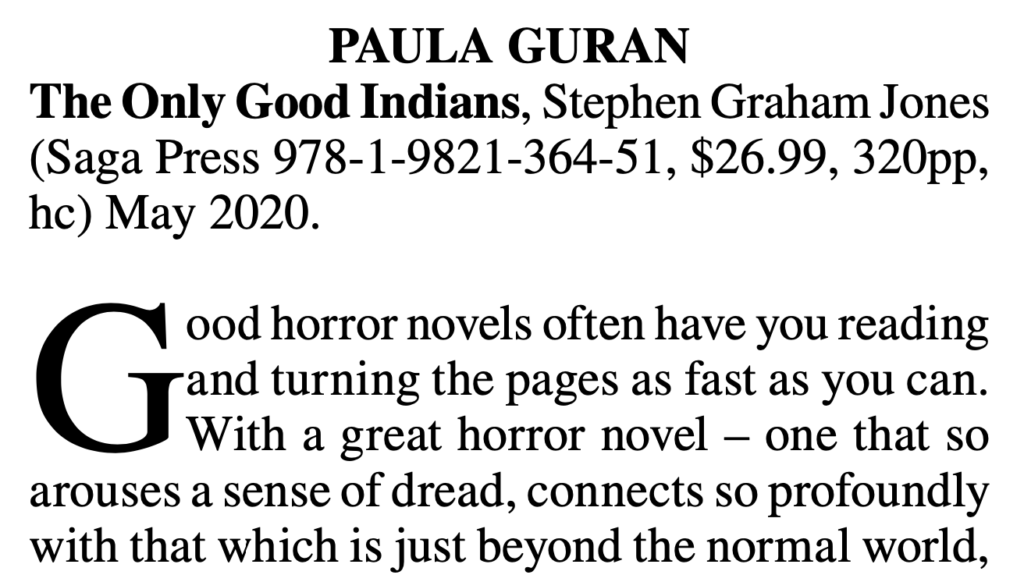 HomeetcCouple more Elk write-ups From the March issue of Locus (got to log in / buy): https://locusmag.com/2020/03/issue-710-table-of-contents-march-2020/ https://paulspicks.blog/2020/03/15/the-only-good-indians-by-stephen-graham-jones/