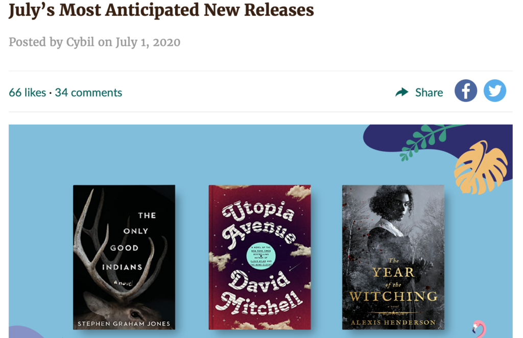 HomeelkCouple more elky lists Probably the last of these “before” lists, since the novel drops tomorrow . . . Goodreads: https://www.goodreads.com/blog/show/1863-july-s-most-anticipated-new-releases WCVB: https://www.wcvb.com/article/best-books-for-2020/33278736