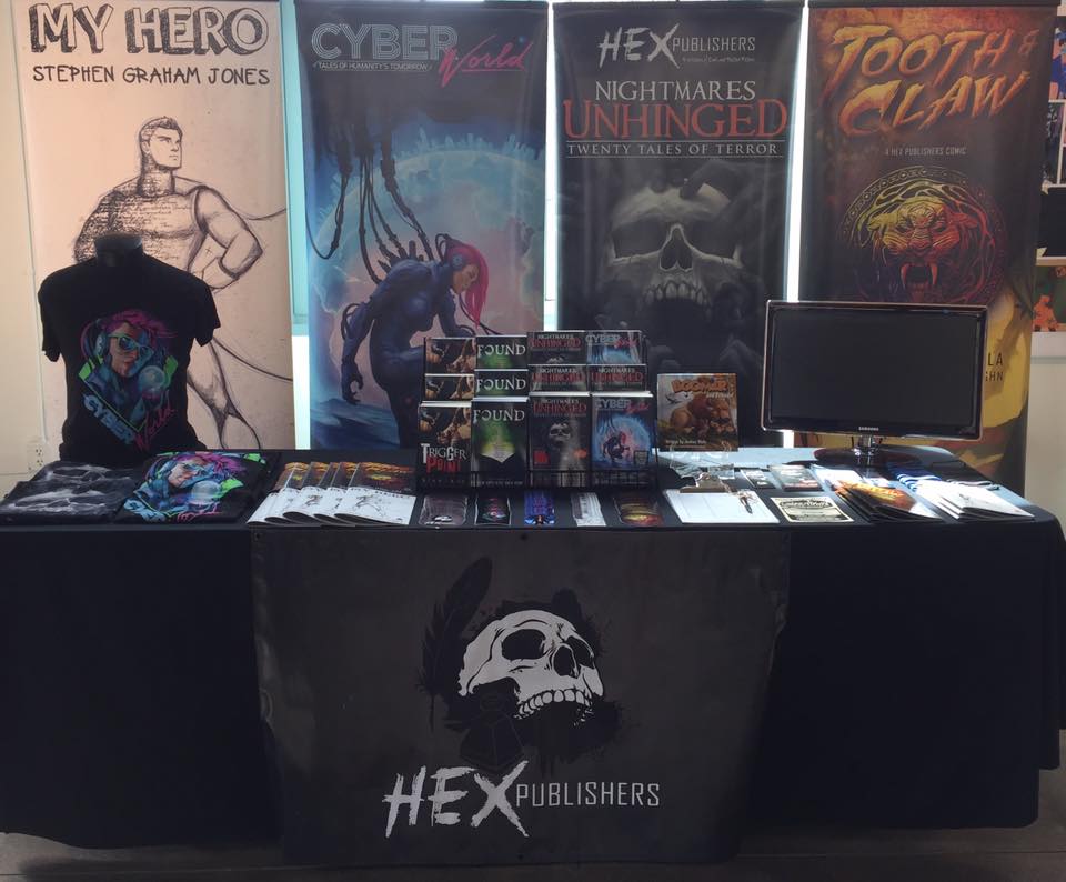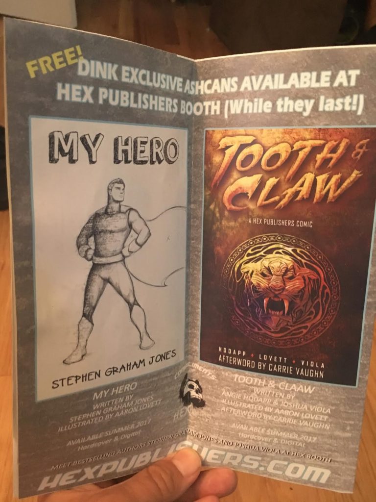 All this visibility, though: Hex does a con up right. And we (Josh, Dean, me) passed out a box or two of free My Hero earlies/samplers. Full version coming in a couple months: hardback, color, got the afterword-cum-letters column.