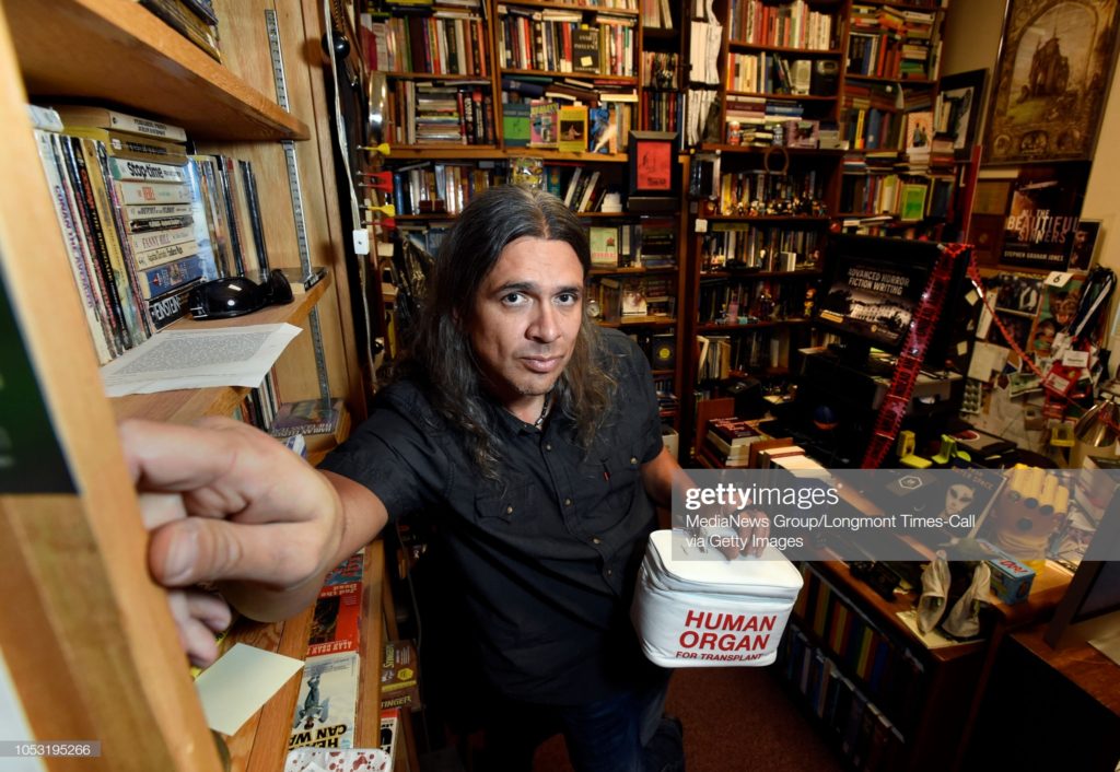 BOULDER, CO – OCTOBER 10, 2018: University of Colorado Ivena Baldwin Professor of English Stephen Graham Jones in his office of full of horror and zombie literature and memorabilia on Wednesday on the CU campus in Boulder. (Photo by Jeremy Papasso/Digital First Media/Boulder Daily Camera via Getty Images)
