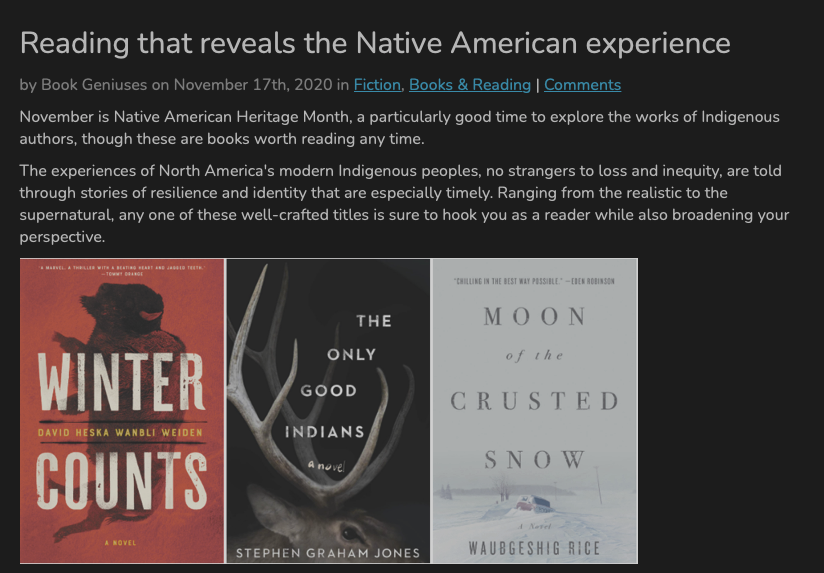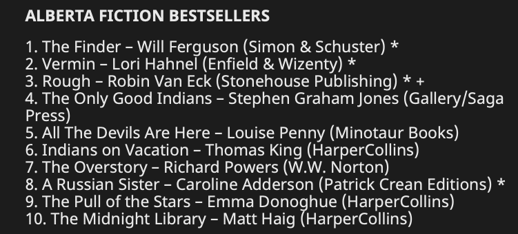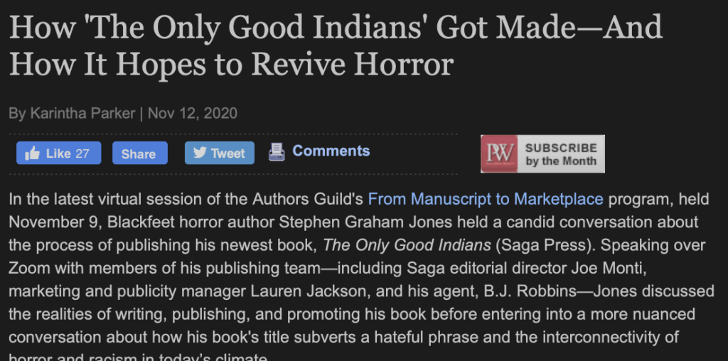 HomeelkElky stuff Last day to vote in this, I believe: https://www.goodreads.com/choiceawards/best-horror-books-2020 Means a lot to be a bestseller up in the good country: https://albertapolitics.ca/2020/11/the-finder-by-alberta-author-will-ferguson-tops-independent-bookshops-fiction-bestseller-list/ https://electricliterature.com/11-books-about-midwesterners-who-arent-trying-to-be-nice/ https://guides.vapld.info/readers/blog/Reading-that-reveals-the-Native-American-experience https://www.publishersweekly.com/pw/by-topic/industry-news/trade-shows-events/article/84866-how-the-only-good-indians-got-made-and-how-it-hopes-to-revive-horror.html @stephanierabig First book review here! Stephen Graham Jones’s “The Only Good Indians”.#60secondbookreview #booktok #horrornovel #horror ♬ original sound – Stephanie Rabig (no clue if this embed’ll work . . . )