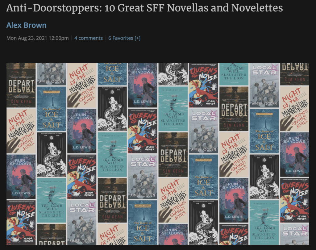 HomeetcFew links (reviews, lists, cool stuff) https://bookriot.com/fictional-female-serial-killers/ https://www.tor.com/2021/08/23/anti-doorstoppers-10-great-sff-novellas-and-novelettes/ https://twitter.com/tvayyyy/status/1429640011087974407?s=21