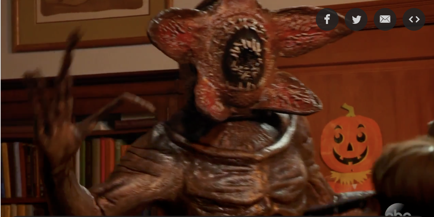 This is probably only funny if you grew up watching Perfect Strangers—”Perfect Stranger Things” feels like a Jeopardy! question to a mashup answer—but never mind all that. What matters here? This costume. I wonder how that face petals opens like that? Animatronic? Air? I mean, the spindly fingers are useless, but so what. And I dig the platform shoes/feet. I want to be this for Halloween, please: