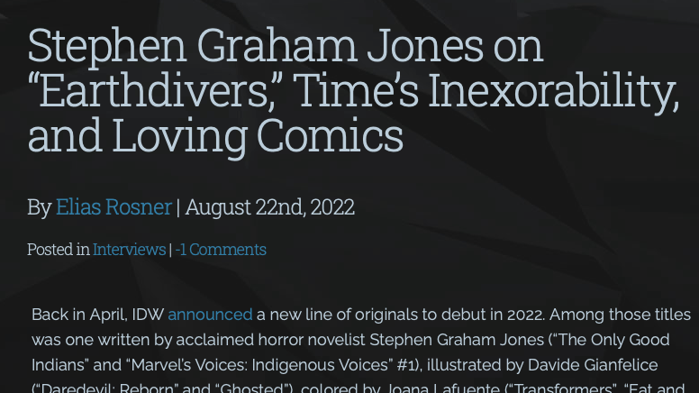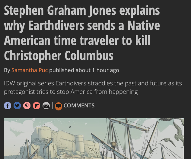 HomeearthdiversFour Earthdivers Interviews http://www.multiversitycomics.com/interviews/stephen-graham-jones-earthdivers/ INTERVIEW: Stephen Graham Jones talks killing Christopher Columbus in EARTHDIVERS https://www.gamesradar.com/stephen-graham-jones-explains-why-earthdivers-sends-a-native-american-time-traveler-to-kill-christopher-columbus/ And, cool video: NY Times bestselling author @SGJ72 makes his ongoing comics debut with #Earthdivers an @IDWPublishing Original. @DavideGianfe @JoanaLafuente With covers by @rafaalbuquerque @thewolfmaria @cjwardart @ecampbelldammit Earthdivers #1 FOC August 29 – On Sale October 5th pic.twitter.com/c6EcKuyObo— PRH International Comics (@PRHIntlcomics) August 24, 2022