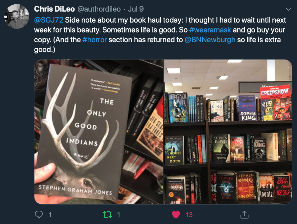 HomeelkHorror Section at B&N! We’re getting back to good days! https://twitter.com/authordileo/status/1281340513887690753?s=20