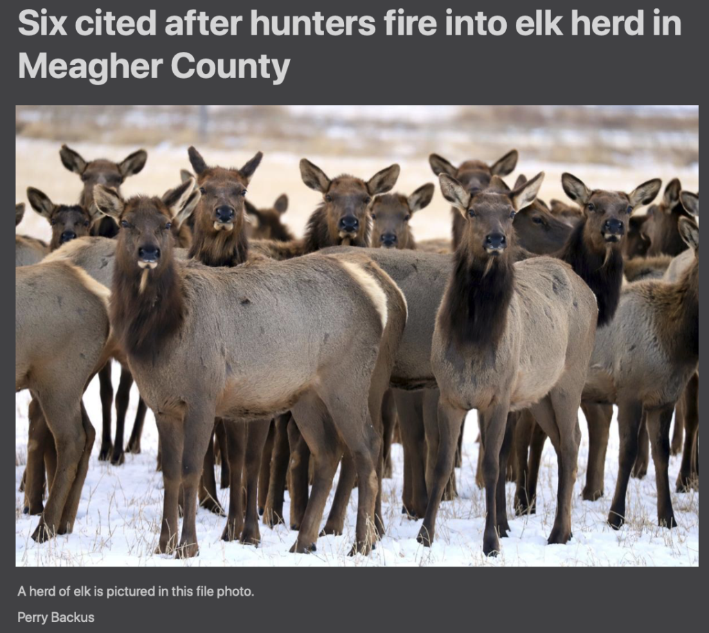 HomeelkIf they’d read Good Indians . . . They’d know better than this. Also: hunting in a group of ONE HUNDRED? This must have been a battle zone, man: https://helenair.com/news/local/six-cited-after-hunters-fire-into-elk-herd-in-meagher-county/article_13a375f9-5993-5ba7-9cba-8861e02590fc.html