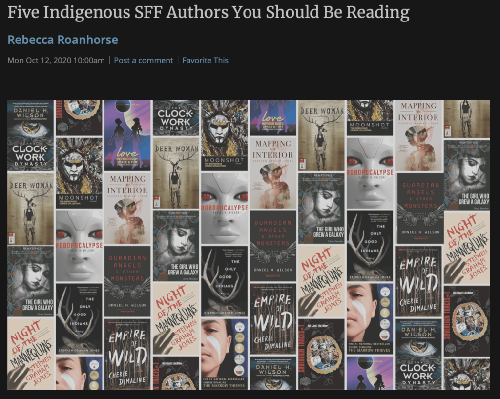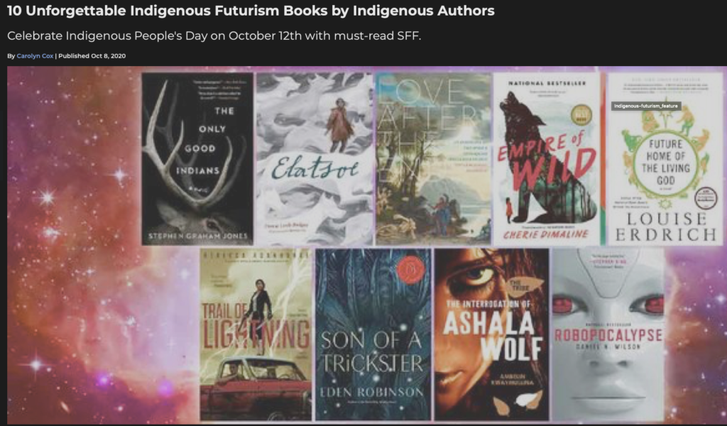 HomeelkIndigenous People’s Day Owl Goingback says it best: pic.twitter.com/jh747JVUlC— Owl Goingback (@OGoingback) October 12, 2020 And, I’ll update this should more of these lists show up, but here’s the two I’ve caught so far: https://www.tor.com/2020/10/12/five-indigenous-sff-authors-you-should-be-reading/ https://theportalist.com/indigenous-authors-sci-fi-fantasy https://libro.fm/indigenous https://bookmarks.reviews/13-of-the-most-anticipated-books-by-indigenous-authors-for-the-second-half-of-2020/ https://www.nypl.org/blog/2020/10/09/honoring-indigenous-peoples-recommended-reads We're celebrating #IndigenousPeoplesDay with these recent releases from these #indigenousvoices @ShiningComic @SGJ72 @WanbliWeiden @LouiseErdrich @abirdsaun13 @kellijoford Thank you for sharing your voices. #indigenousvoicesmatter #readingcommunity pic.twitter.com/ChPtD2Nfdz— The Book Market (@Hangar_One) October 12, 2020