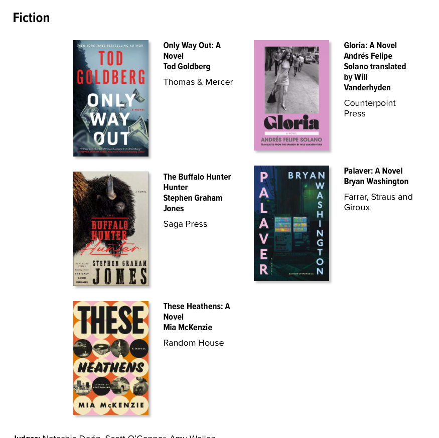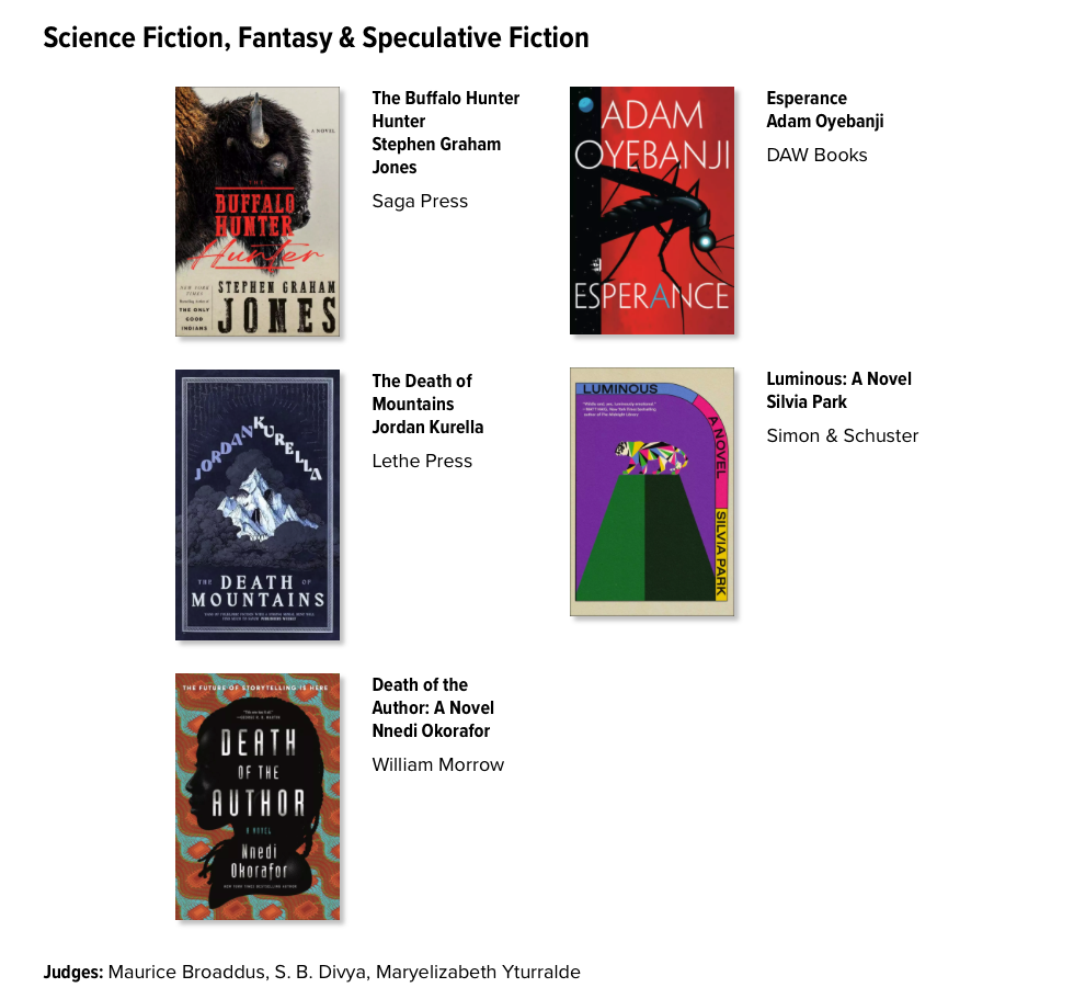 I hear that maybe The Buffalo Hunter Hunter is the first novel to be a finalist in TWO categories? Could be, not sure. Either way, super honored by it—thrilled to be alongside these amazing writers and their excellent books: