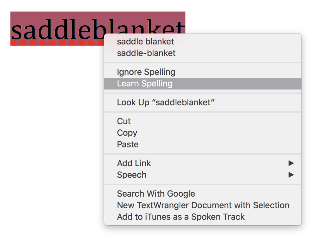 Anyway, if I’m writing a western-type thing, and for some reason I want that to be one word—maybe I’m working under a 10K-word cap, so am trying real hard to cheat in a way I can claim is stylistic preference or regional usage or actual pronunciation or something—then, instead of having to look at it like that all the time, you tell your Pages to learn it: