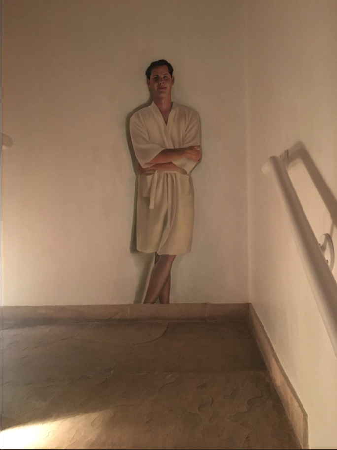 After which I got so lost and signal-less in the snowy mountains over Santa Fe in a rental car that my seven-hour drive was closer to eleven. But, speaking of that gym at the Hotel Santa Fe, the stairway UP to it has a completely startling photo-realistic life-size dude painted on the wall: