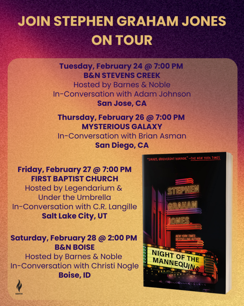 I’m teaching the Stegner Fellows at Stanford in the Spring, so, when Nightfire releases Night of the Mannequins in February, I’m doing a few stops west of the Rockies.