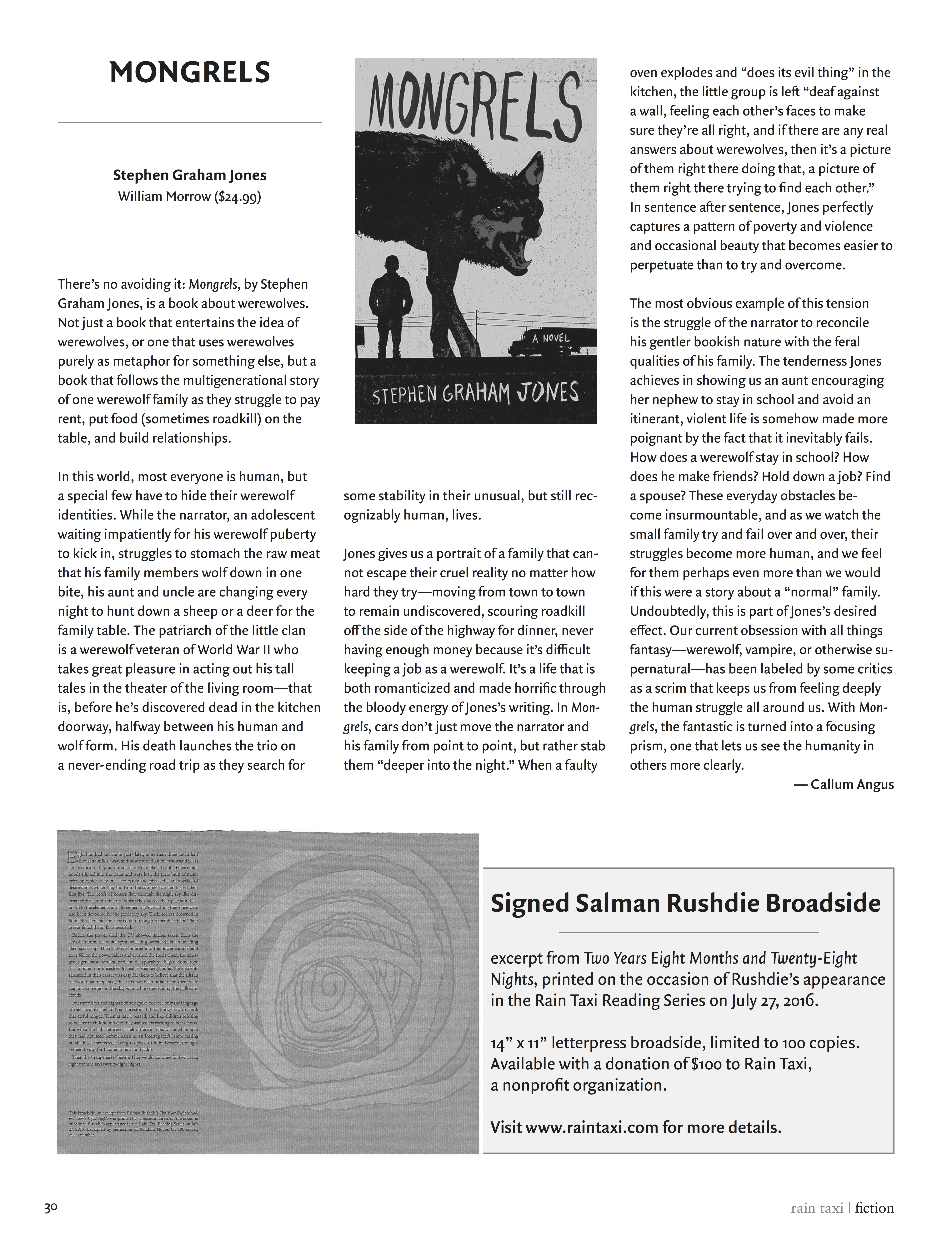 With hints of True Blood and Winter’s Bone, and with lupine tongue tucked well into cheek, Mongrels is at once an adolescent romp through the tangled woods of family history and a rich compendium of werewolf lore old and new. Stephen Graham Jones gifts us with fun characters, imaginative set pieces and an immersive tour of the flat-broke American South that spares no plastic orchid or cable spool coffee table.