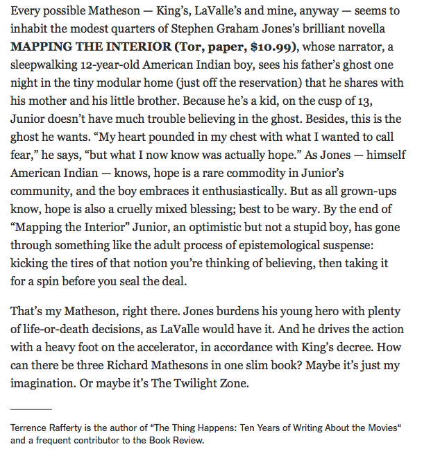 Anyway, nice to be in Terrence Rafferty’s “Roundup of New Horror,” all kind of branching off Richard Matheson’s stuff. Will read through it again, but I think I know nearly everybody in that roundup, except King and Bulkin.