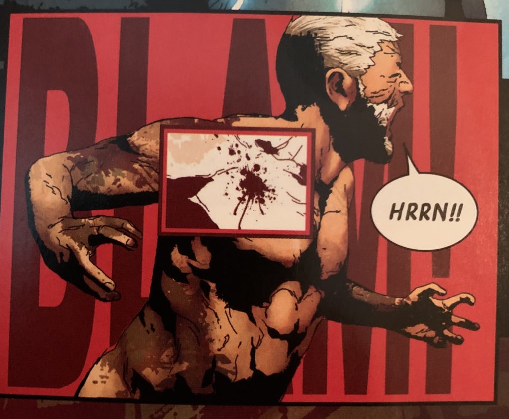 And then that wonderful centerpiece of this panel, that inset that highlights the actual bullet splashing into Logan’s actual shoulder. This isn’t one of those magnifying-lens insets you see sometime, that are kind of Chris Ware-diagrammatic, but a lens that strips out the color, and, importantly, very importantly, it perfectly matches the color of that backdrop SFX, which serves to draw all these stacked layers into a single moment, while still drawing our eye to this square “mini-panel” of impact, as if WE’RE the bullet, boring at high velocity into Logan’s shoulder, into this freeze-framed but highly active hundredth of a second which we can now hear and feel, but all through a strictly visual medium. And the double frame AROUND that inset makes it feel either like we’re telescoping in, or that this impact is rising to meet us — beveling the edge like this is the right border, for sure.
