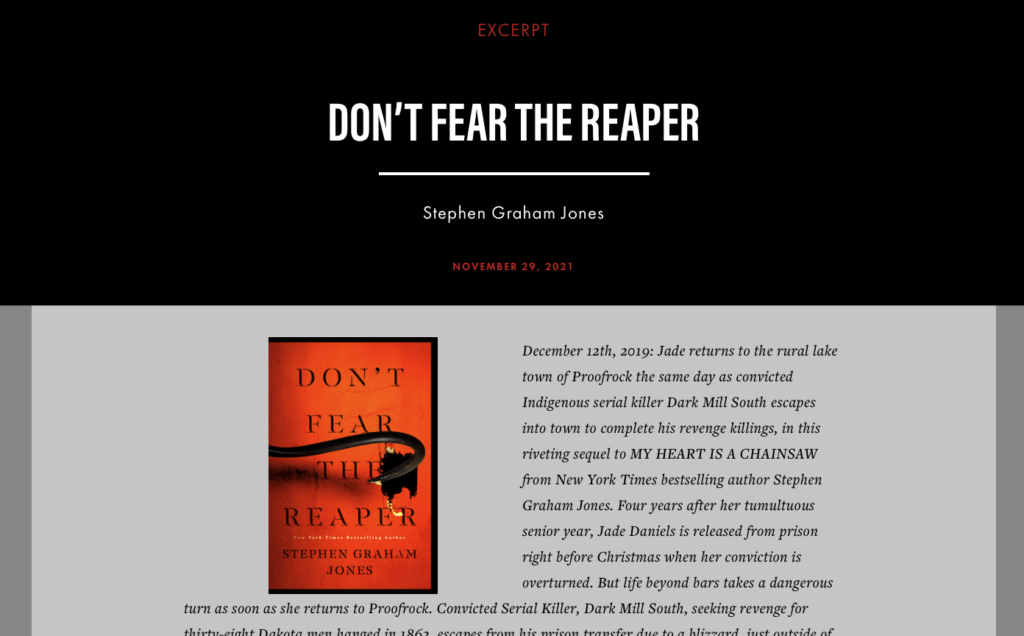 HomechainsawReaper preview + cover Like most cool things, it’s over at Crimereads: https://crimereads.com/excerpt-dont-fear-the-reaper/ Over on TikTok, too: https://twitter.com/d_k_lawhorn/status/1465502859680751616?s=21 (via twitter)