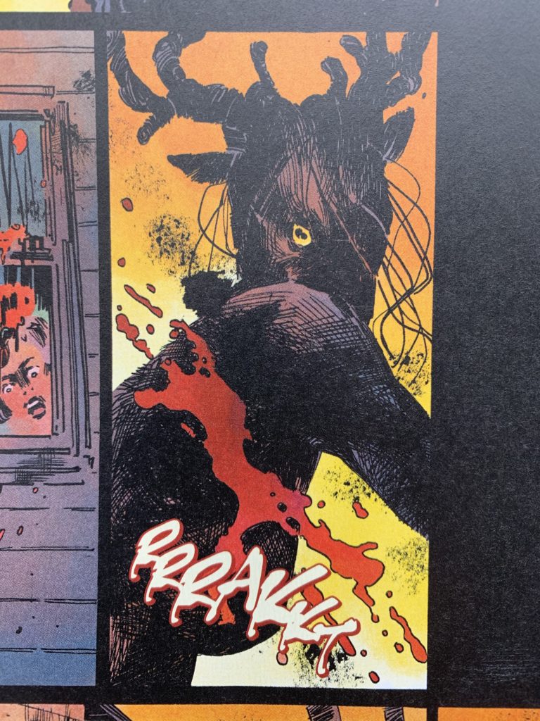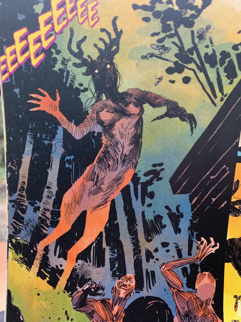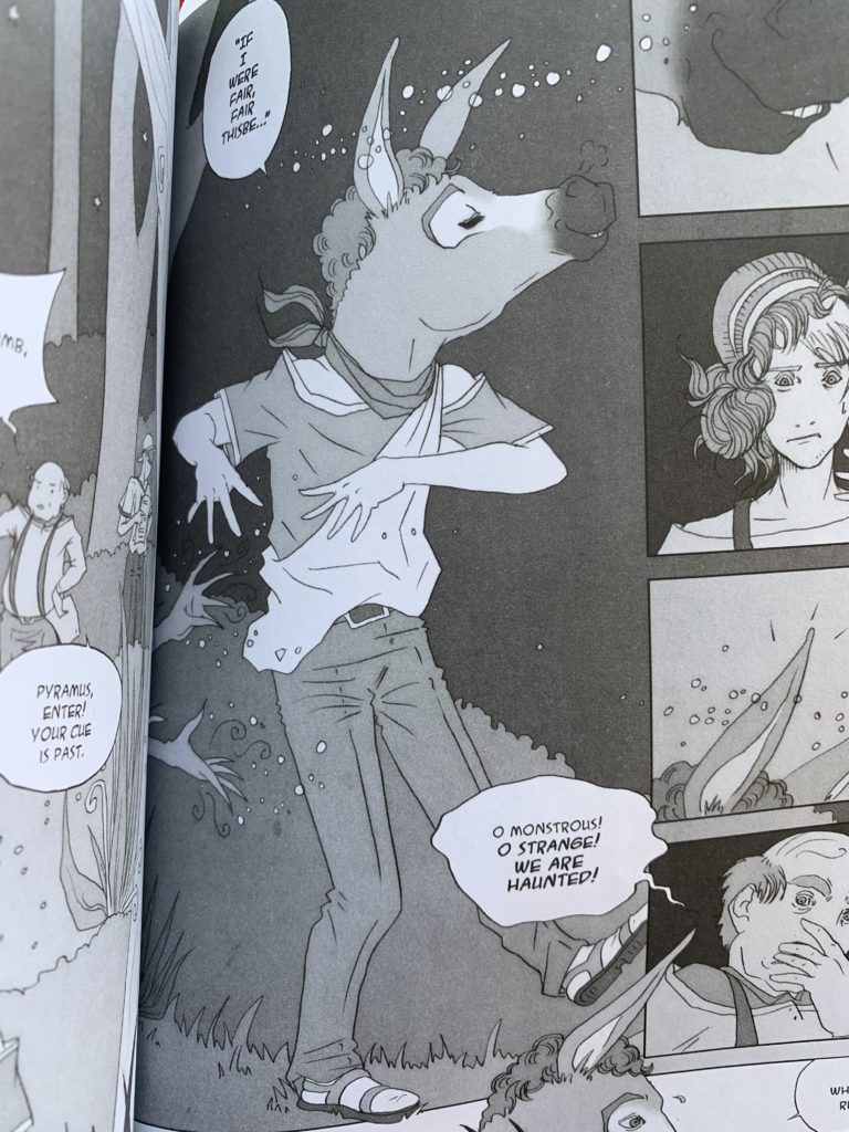 That I’ve stumbled onto the last couple weeks. The Bottom — who actually has a horse-head that, in the dark, could maybe be a cow elk — is from the manga A Midsummer Night’s Dream done by Kate Brown, and the deer-woman’s from Carmen Maria Machado’s The Low, Low Woods. Presumably she wrote something like ‘deer/human monster, female,’ and then Dani, the artist, realized it: