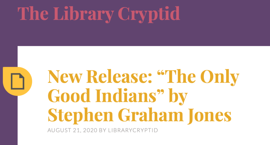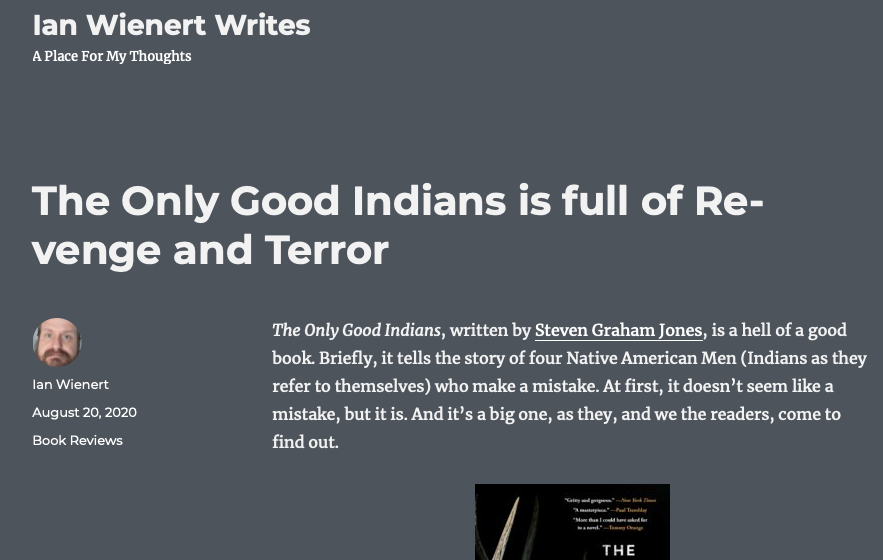 HomeelkSome few elky reviews http://www.themiddleshelf.org/reviews/stephen-graham-jones-the-only-good-indians https://www.ianwwrites.com/posts/the-only-good-indians-is-full-of-revenge-and-terror/ http://erinrockfort.com/blog/lightning-round-reading-challenge-week-33# https://librarycryptid.wordpress.com/2020/08/21/new-release-the-only-good-indians-by-stephen-graham-jones/ View this post on Instagram http://ivebeenreadinglately.blogspot.com/2020/08/retreating-from-everyday-horror-into.html