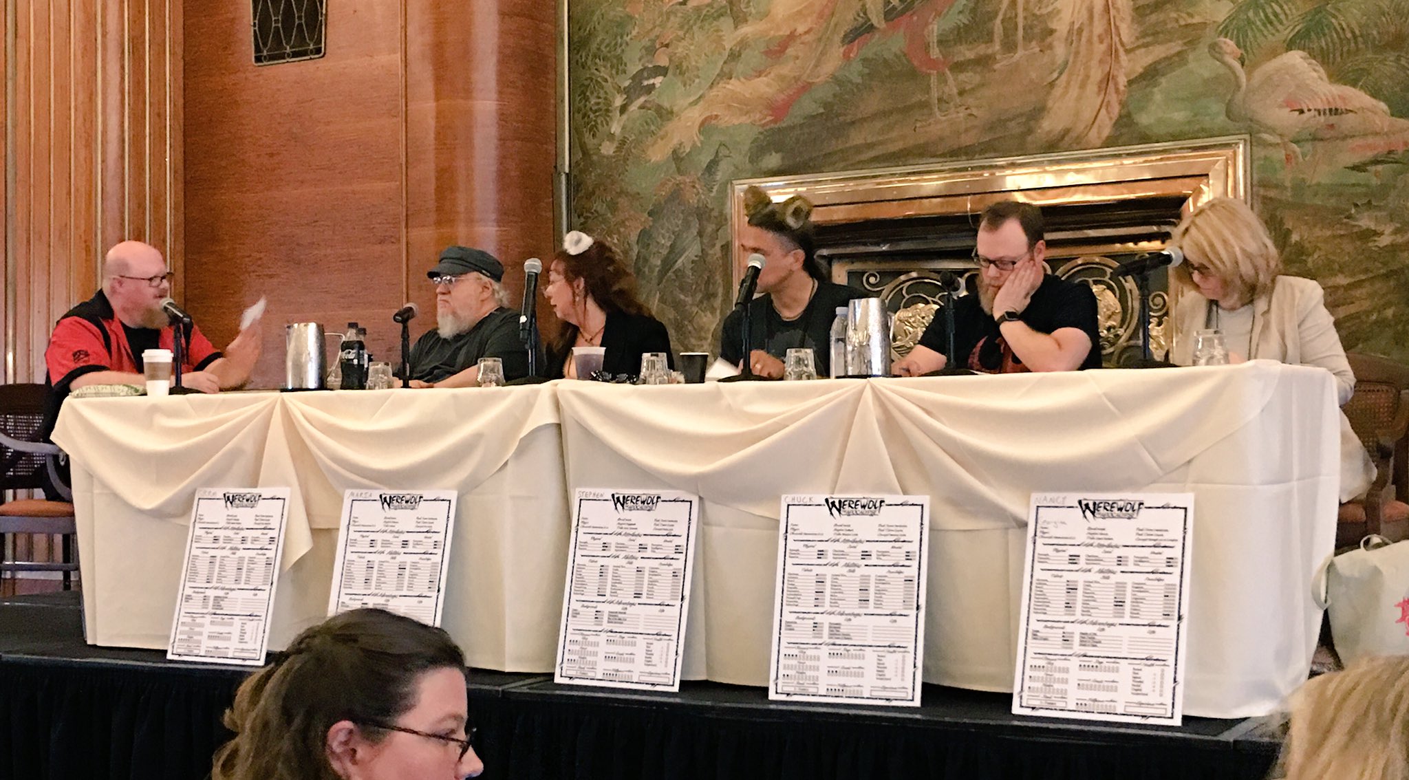That’s me reading “Dear Final Girls” at the Shades & Shadows event. And here’s a game of Werewolf the Apocalypse I got to public-play with the creator of the whole phenomenon, Bill Bridges, along with, after Bill on the far left, George RR Martin, Maria Alexander, some loserdude, Chuck Wending, Nancy Holder (not pictured, the Courtney Cox lifted from the crowd to play a few turns and help us battle a giant glowing sloth at the LaBrea Tar Pits: Danielle DeLisle [nametagged way below]):