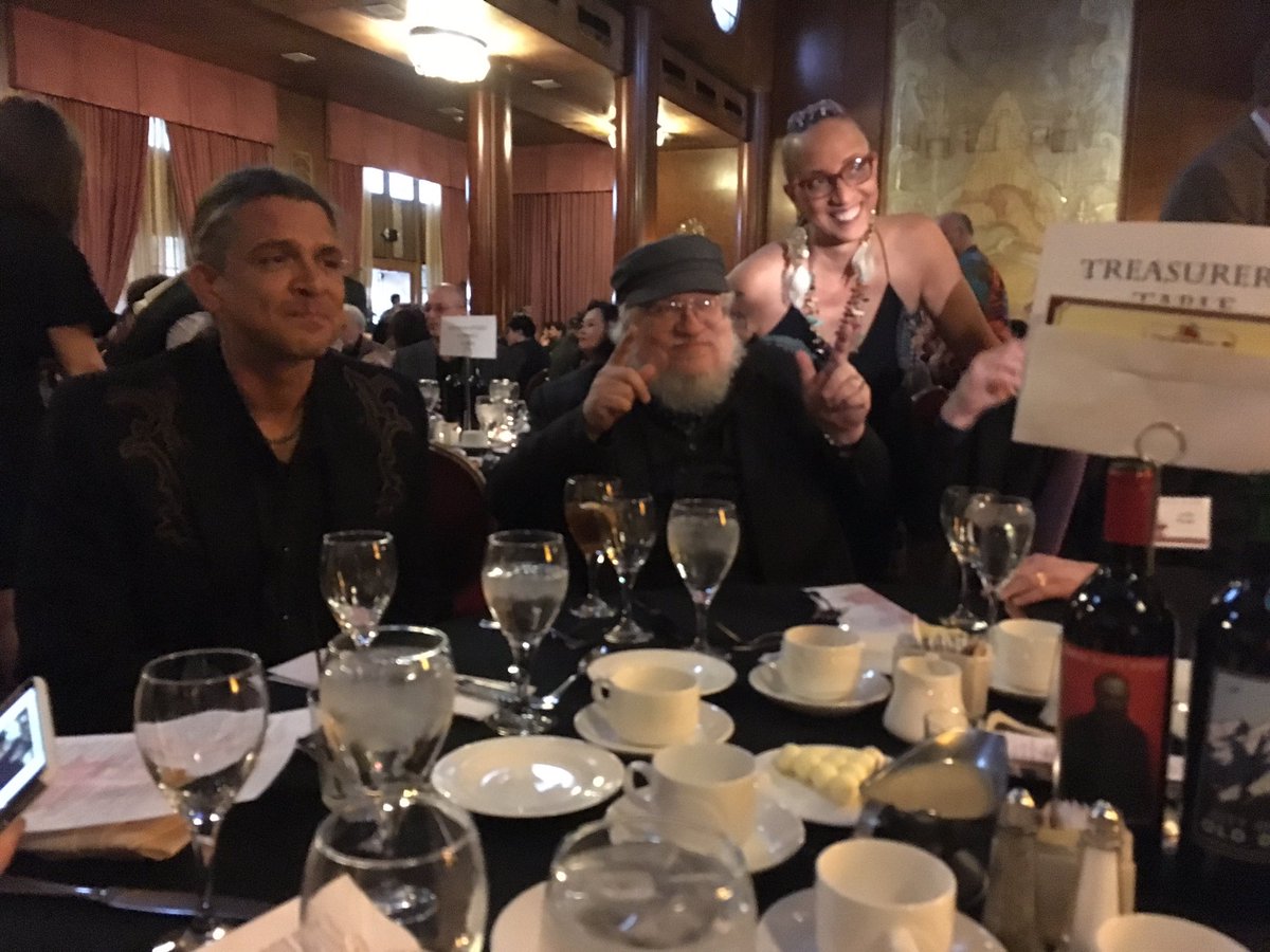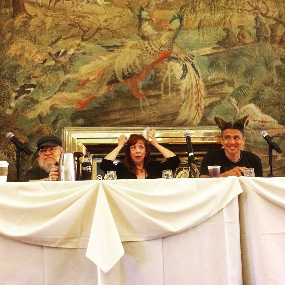 And, I finally got to hang out with Chuck Wendig, with Grady Hendrix, with Becky Spratford (the first of the snapshots, above), with John Joseph Adams, with Liz Hand, with Rob Crowther of Mysterious Galaxy books, with Robb and Livius of Booked Podcast, with Bill Bridges and George RR Martin again. Got to see Craig Clevenger for all of fifteen minutes, in which we both had our knives out, because that’s what you do when you haven’t seen someone for too long, and when you might not see them again for a while. Got to talk a lot with Ellen Datlow, which is always a treat, and, for the first time ever, I tried a crepe. Which my wife is now correcting my pronunciation of. It was apple. There was gross red strings of sweet taste all dripped across it, but I found a lonely clean one. It was good in the middle, like a mini apple pie, but kind of gross on the thin-pancakey outside. Maybe I’m not a crepe-r, I guess. But I am immensely brave for having tried a new food, with my own actual mouth.