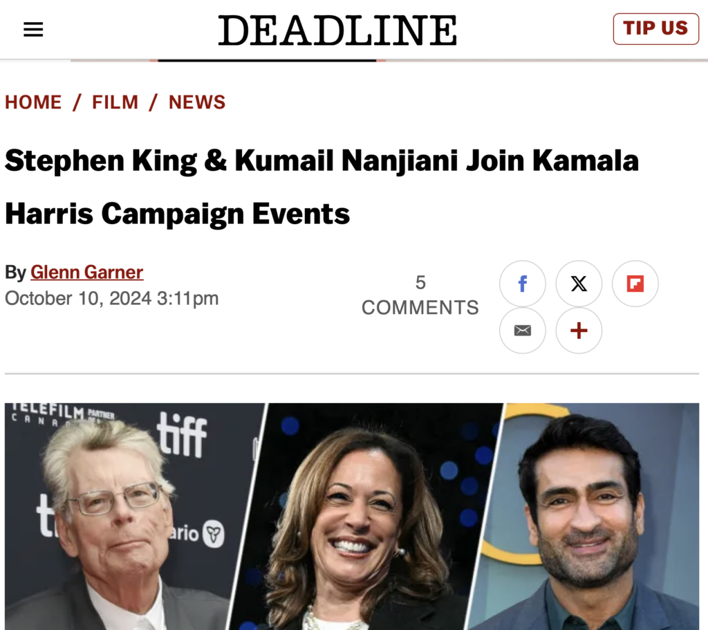 HomenewsThe 15th, here https://deadline.com/2024/10/stephen-king-kumail-nanjiani-join-kamala-harris-campaign-events-1236112944/