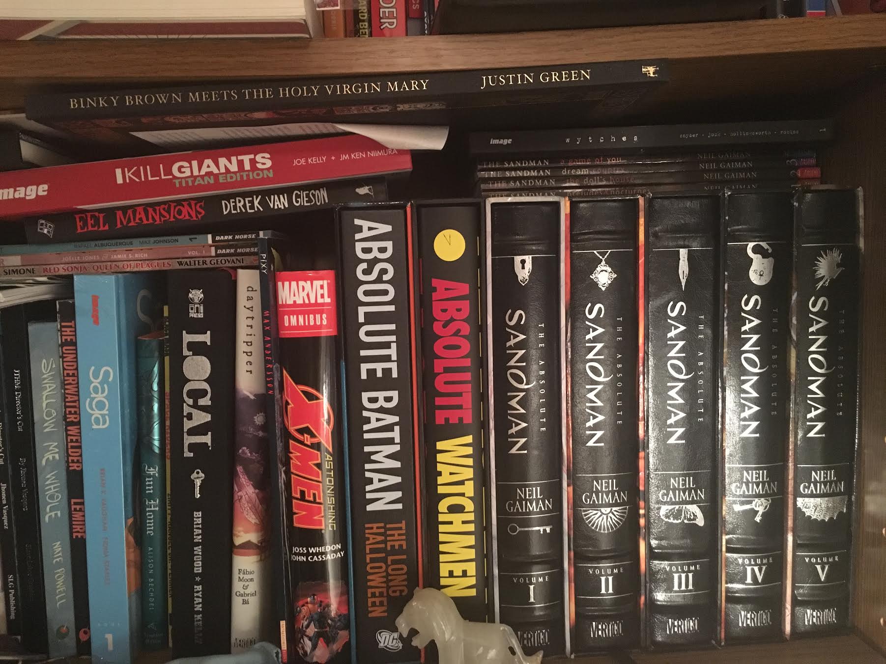 And, yeah, I clipped off half of the comic book shelf. Oh well. Here’s some of what you couldn’t see—some of my favorites: