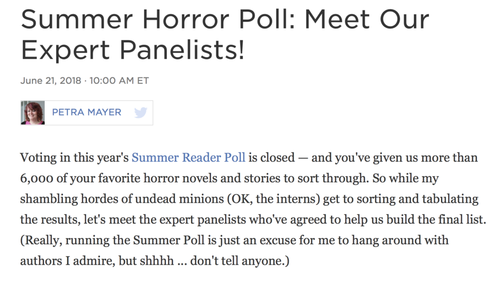 HomenewsThe Horror, the Horror! https://www.npr.org/2018/06/21/621953925/summer-horror-poll-meet-our-expert-panelists?platform=hootsuite