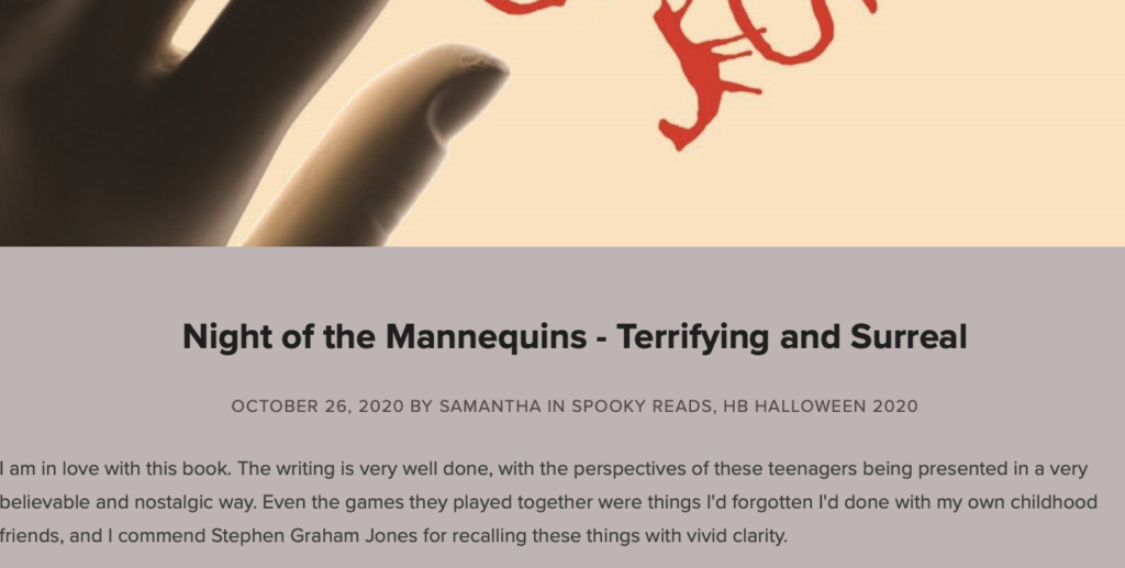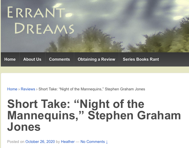 HomenewsThree Mannequins Walk Into a Display Window: https://thelibraryladies.com/2020/10/27/kates-review-night-of-the-mannequins/ https://www.horrorbound.net/blog/2020/9/30/night-of-the-mannequins-review http://www.errantdreams.com/2020/10/short-take-night-of-the-mannequins-stephen-graham-jones/