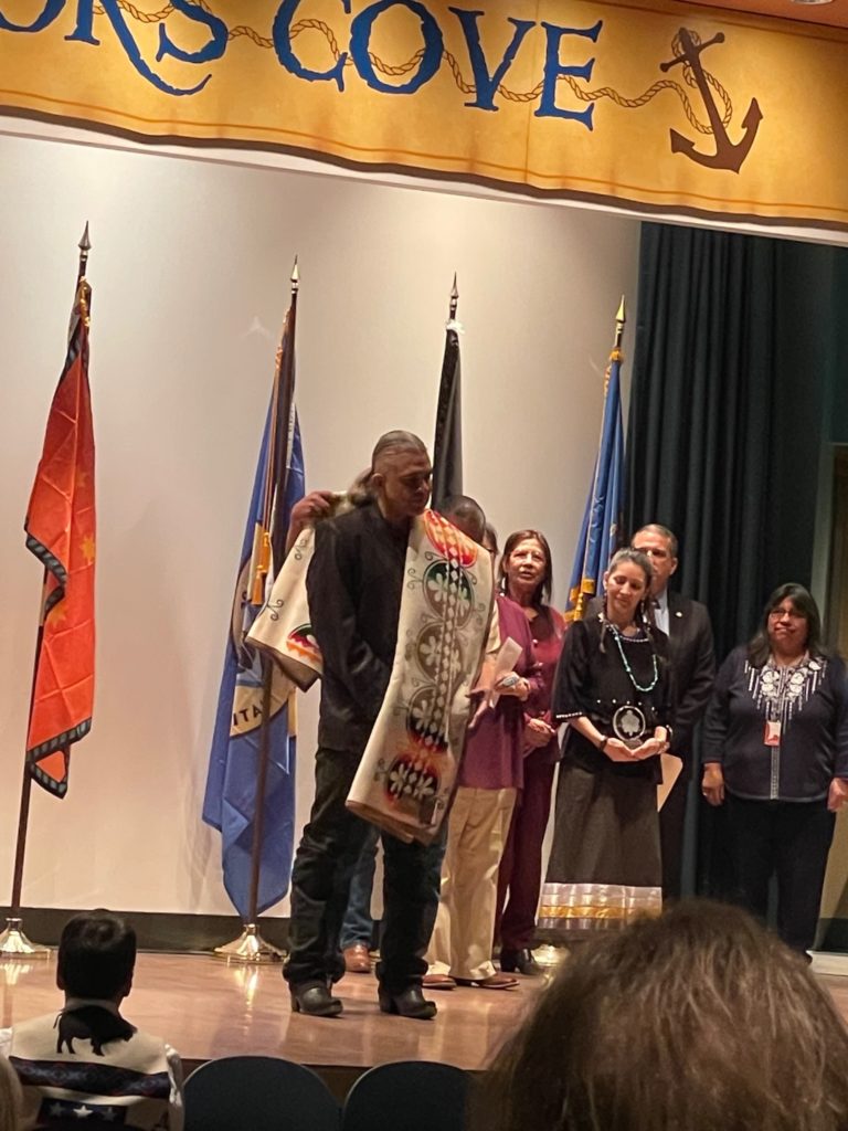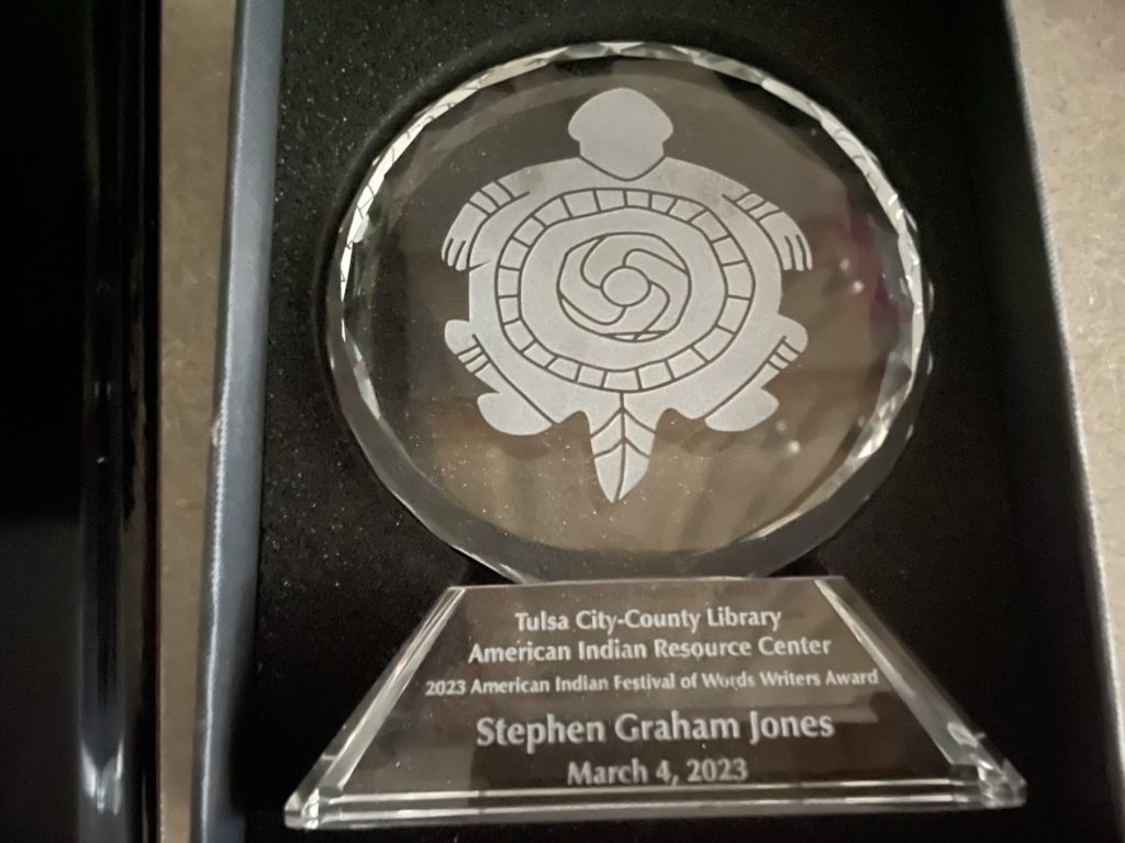 Just back. Another whirlwind thirty-six hour turnaround, but, man, got to talk with so many cool and excellent people, got to be part of the coolest awards ceremony—singing, drumming, storytellers, veterans. It was this: