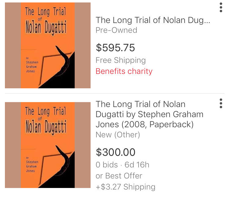Scooting through eBay the other day, looking for a good cloth version of Crichton’s Eaters of the Dead—a novel I’ll never not be in love with (though my favorite film adaptation of Beowulf is Outlander, of course)—I remembered that I’ve had a few people in my inbox and around lately asking did I have any The Long Trial of Nolan Dugattis lying around. I don’t, just have my one that I hauled around for a while, read from. But, looks like I should have secreted a box of them away, to retire on: